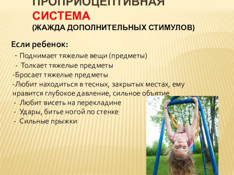 - Имеет потребность раскачиваться, качаться, вращаться, прыгать.