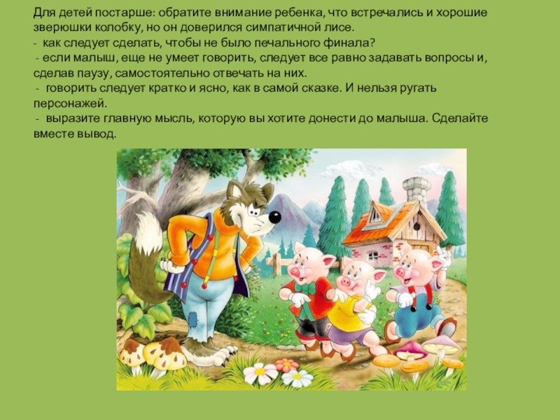 Слайд 10Для детей постарше: обратите внимание ребенка, что встречались и хорошие зверюшки