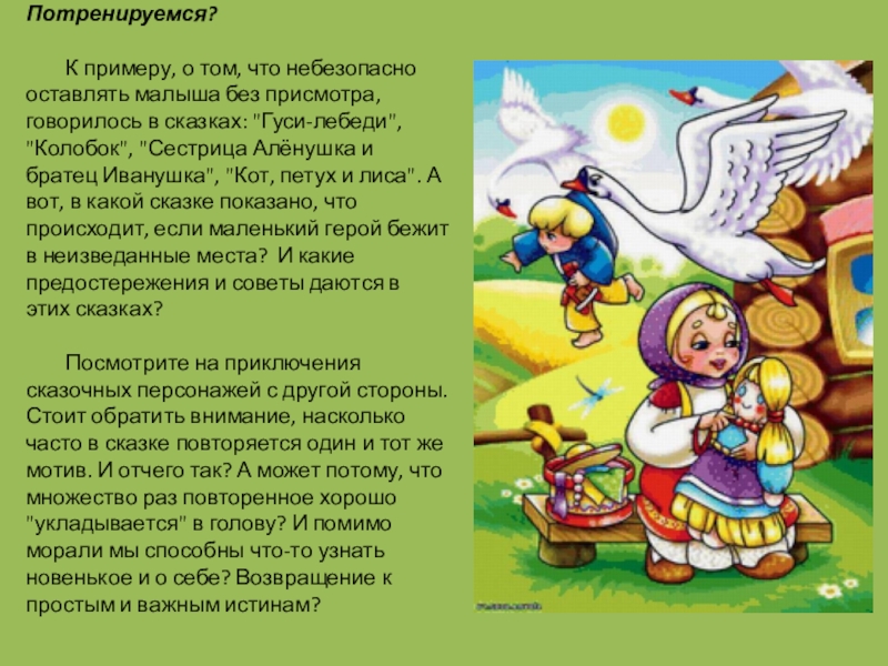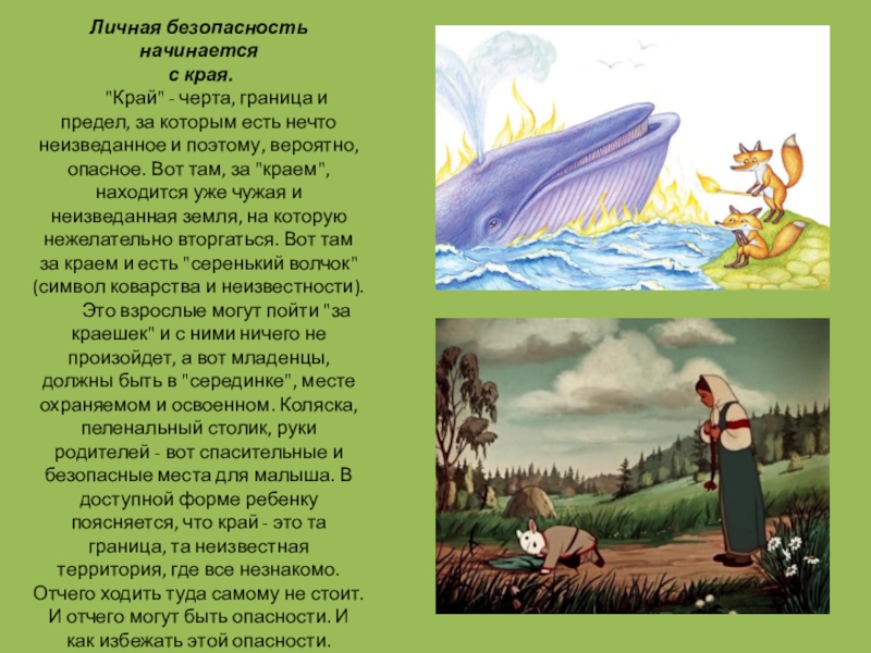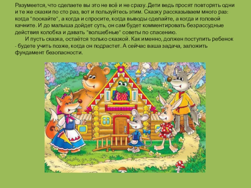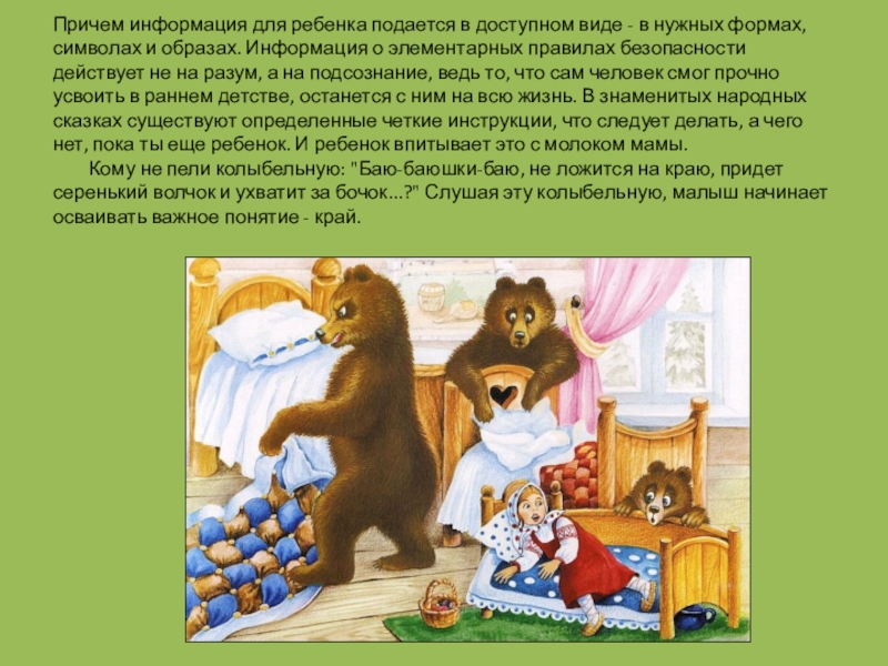 формах, символах и образах. Информация о элементарных правилах безопасности действует не на разум, а на подсознание, ведь то, что сам человек смог прочно усвоить в раннем детстве, останется с ним на всю жизнь. В знаменитых народных сказках существуют определенные четкие инструкции, что следует делать, а чего нет, пока ты еще ребенок. И ребенок впитывает это с молоком мамы.