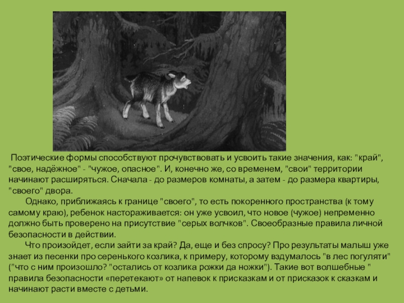 Что произойдет, если зайти за край? Да, еще и без спросу? Про результаты малыш уже знает из песенки про серенького козлика, к примеру, которому вздумалось "в лес погуляти" ("что с ним произошло? "остались от козлика рожки да ножки"). Такие вот волшебные " правила безопасности «перетекают» от напевок к присказкам и от присказок к сказкам и начинают расти вместе с детьми.