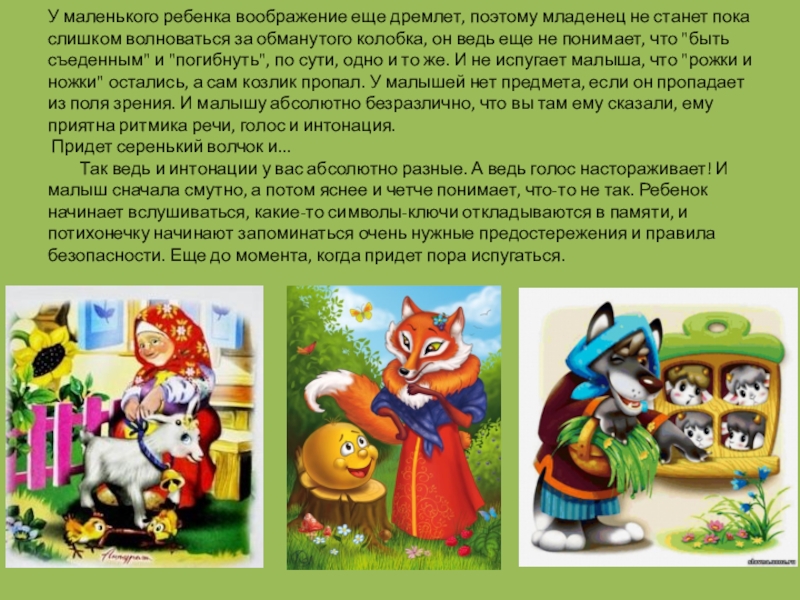 слишком волноваться за обманутого колобка, он ведь еще не понимает, что "быть съеденным" и "погибнуть", по сути, одно и то же. И не испугает малыша, что "рожки и ножки" остались, а сам козлик пропал. У малышей нет предмета, если он пропадает из поля зрения. И малышу абсолютно безразлично, что вы там ему сказали, ему приятна ритмика речи, голос и интонация.