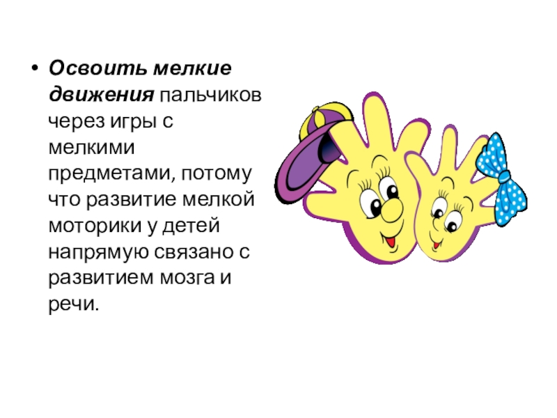 Слайд 6Освоить мелкие движения пальчиков через игры с мелкими предметами, потому что развитие
