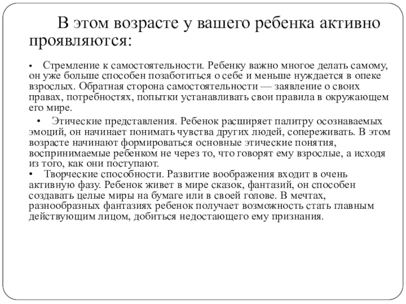 самостоятельности. Ребенку важно многое делать самому, он уже больше способен позаботиться о себе и меньше нуждается в опеке взрослых. Обратная сторона самостоятельности — заявление о своих правах, потребностях, попытки устанавливать свои правила в окружающем его мире.