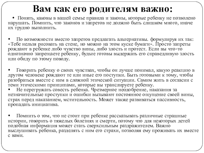 и законы, которые ребенку не позволено нарушать. Помнить, что законов и запретов не должно быть слишком много, иначе их трудно выполнить.
