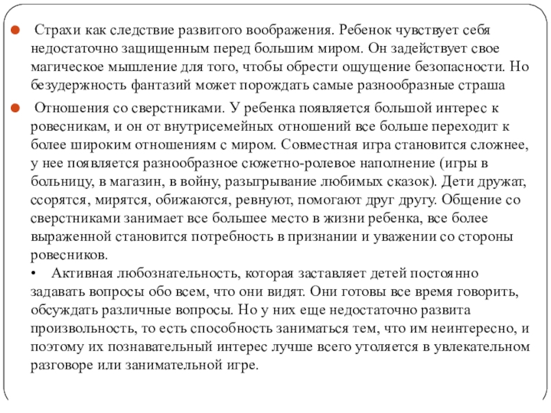 перед большим миром. Он задействует свое магическое мышление для того, чтобы обрести ощущение безопасности. Но безудержность фантазий может порождать самые разнообразные страша