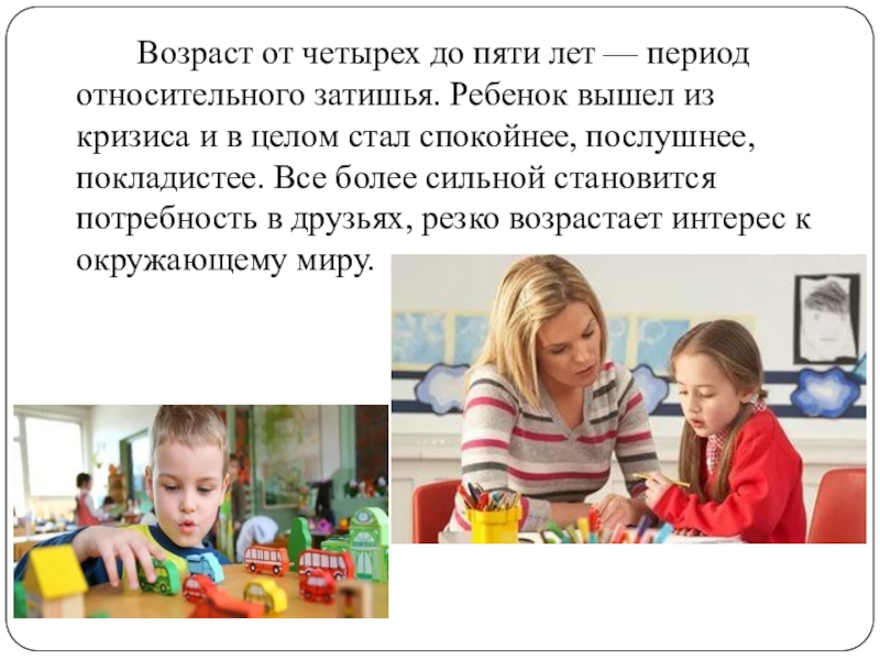 Слайд 2 Возраст от четырех до пяти лет — период относительного затишья. Ребенок