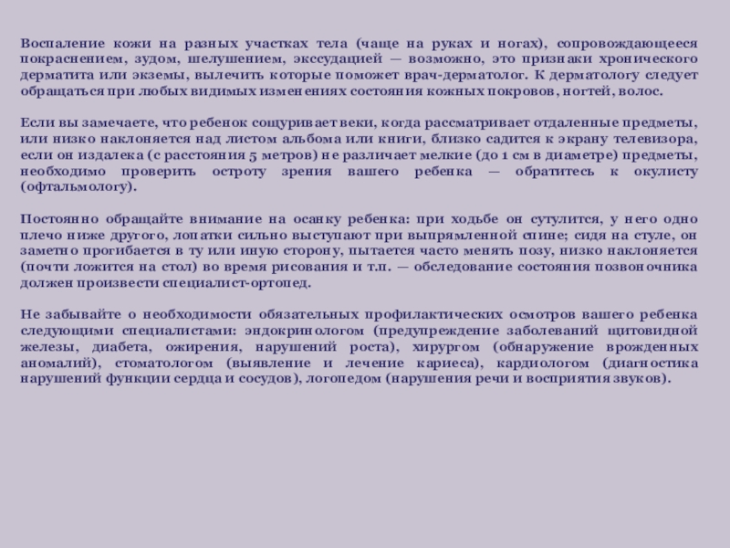 Обращение за консультацией врача-аллерголога необходимо в тех случаях, если в дошкольном периоде у ребенка возникает реакция (сыпь, отек, затрудненное дыхание, внезапный насморк, чихание) на какую-то пищу, запахи, пыльцу цветов, лекарства, прививки.