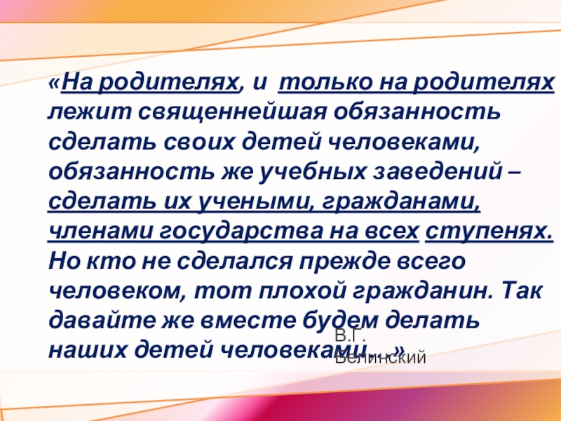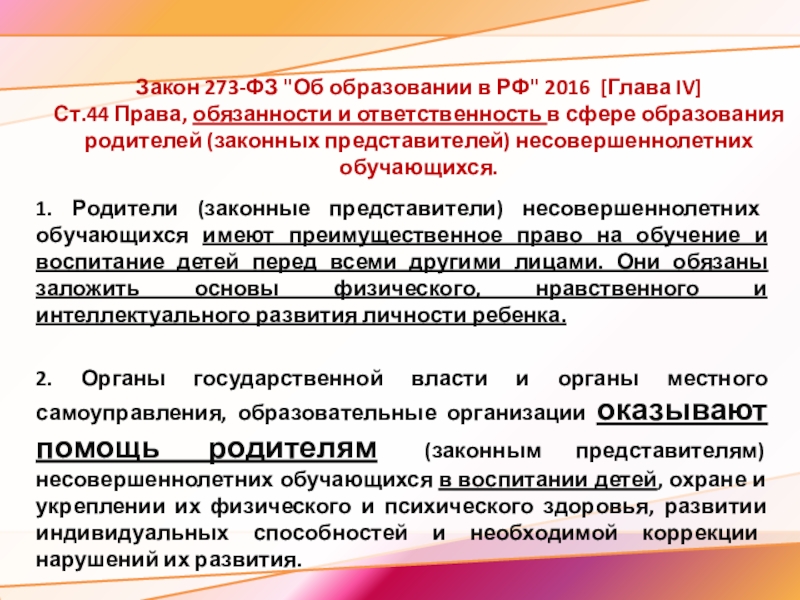 1. Родители (законные представители) несовершеннолетних обучающихся имеют преимущественное право на обучение и воспитание детей перед всеми другими лицами. Они обязаны заложить основы физического, нравственного и интеллектуального развития личности ребенка.