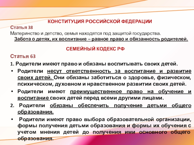 Забота о детях, их воспитание – равное право и обязанность родителей.