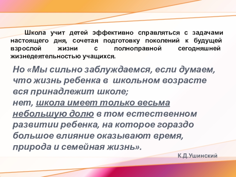 Но «Мы сильно заблуждаемся, если думаем, что жизнь ребенка в школьном возрасте вся принадлежит школе;