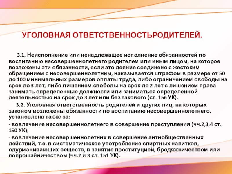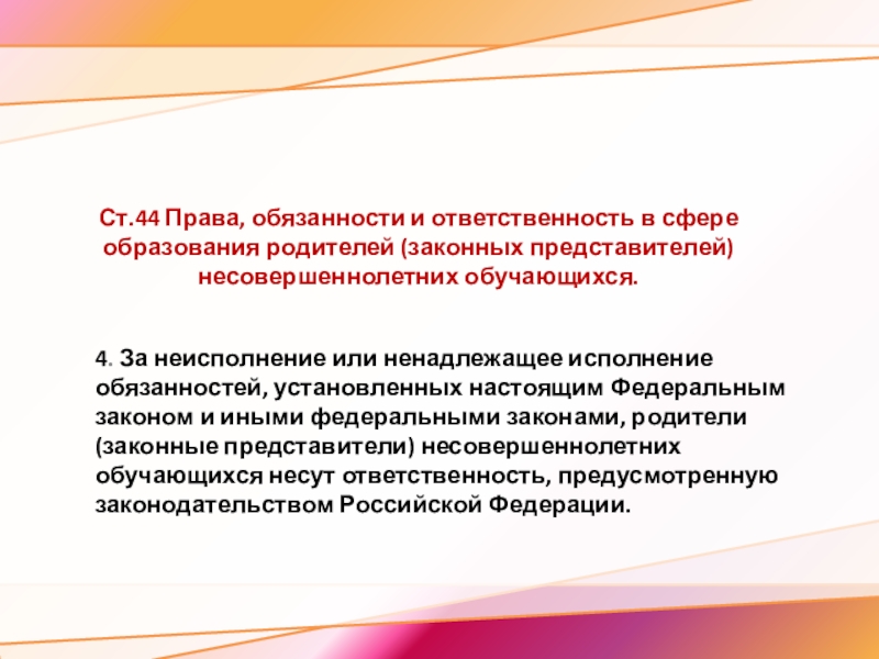 4. За неисполнение или ненадлежащее исполнение обязанностей, установленных настоящим Федеральным законом и иными федеральными законами, родители (законные представители) несовершеннолетних обучающихся несут ответственность, предусмотренную законодательством Российской Федерации.