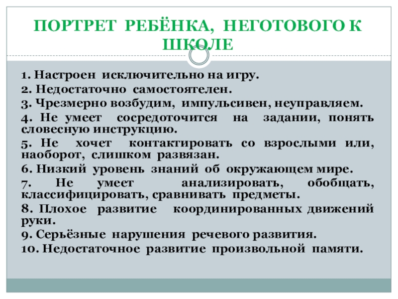 Слайд 25ПОРТРЕТ РЕБЁНКА, НЕГОТОВОГО К ШКОЛЕ