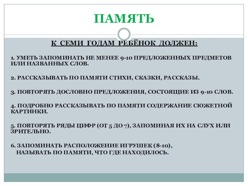 1. Уметь запоминать не менее 9-10