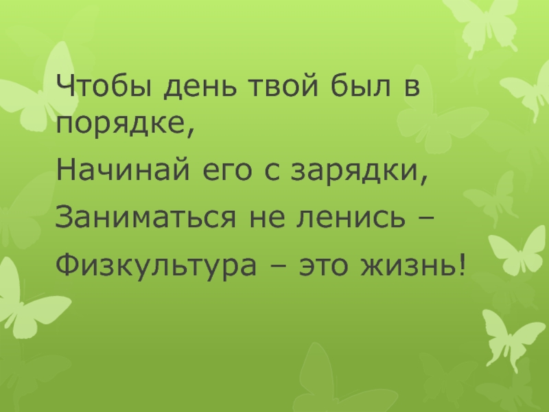 Чтобы день твой был в порядке,Начинай его с зарядки,Заниматься не ленись – Физкультура – это жизнь!