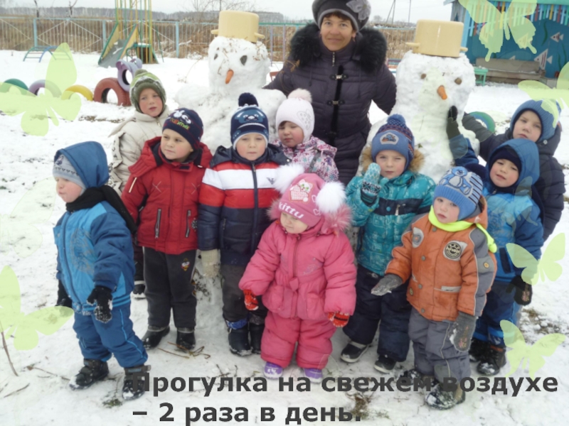 Слайд 10Прогулка на свежем воздухе – 2 раза в день.