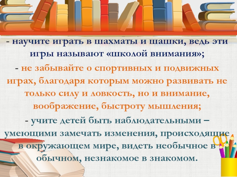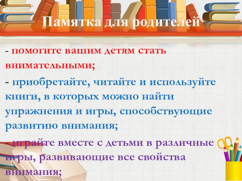 Памятка для родителей- помогите вашим детям стать внимательными;- приобретайте, читайте и используйте книги, в которых можно найти