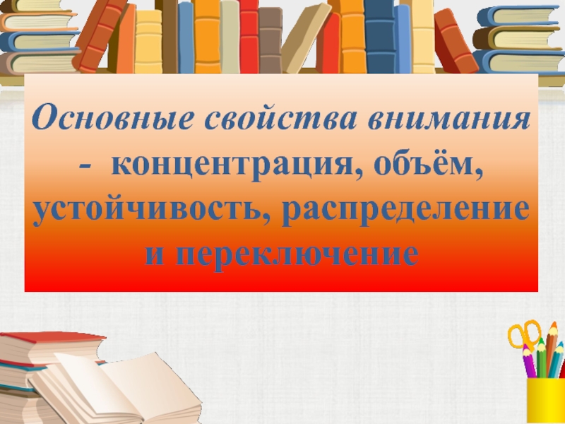 Слайд 8Основные свойства внимания - концентрация, объём, устойчивость, распределение и переключение