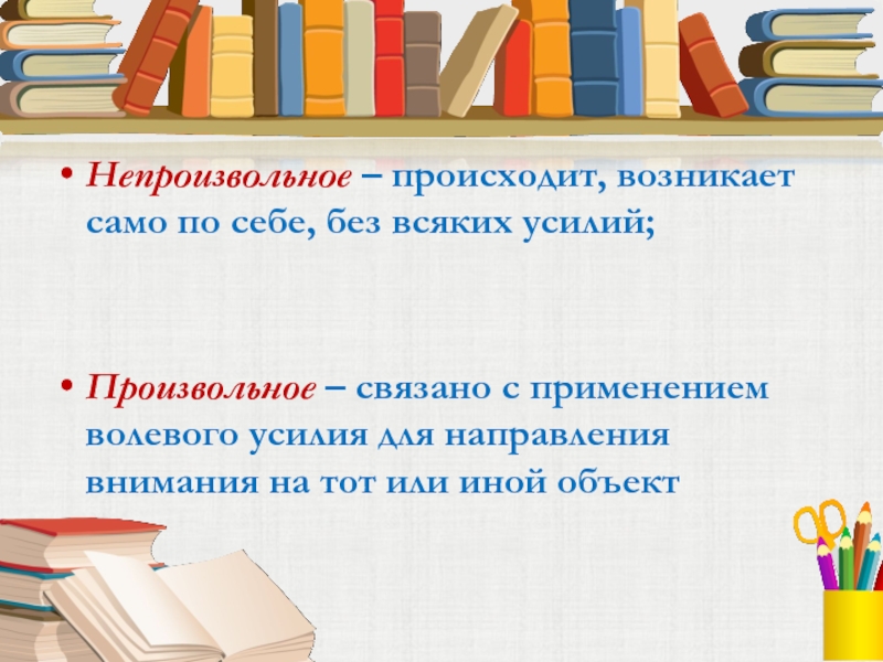 Непроизвольное – происходит, возникает само по себе, без всяких усилий;Произвольное – связано с применением волевого усилия для