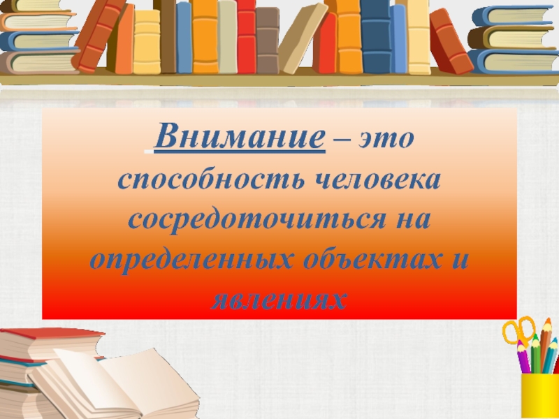 Слайд 4 Внимание – это способность человека сосредоточиться на определенных объектах и
