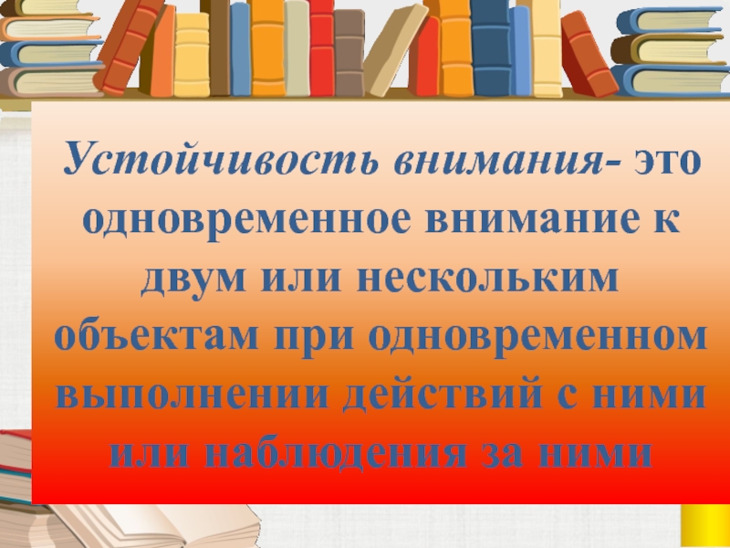 Устойчивость внимания- это одновременное внимание к двум или нескольким объектам при одновременном выполнении действий с ними или