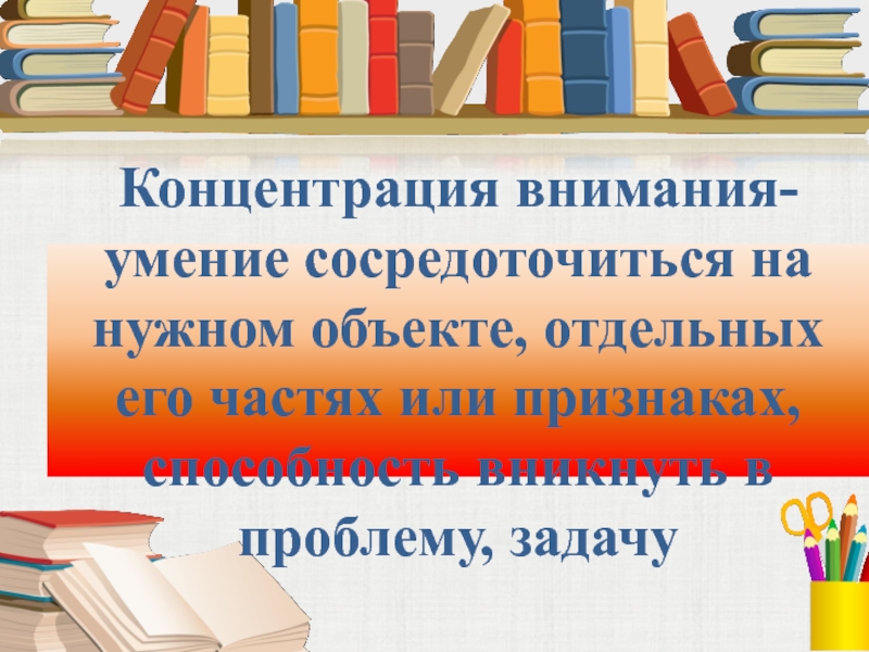 Слайд 9Концентрация внимания- умение сосредоточиться на нужном объекте, отдельных его частях или