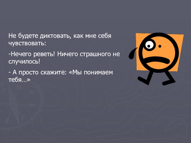Не будете диктовать, как мне себя чувствовать:-Нечего реветь! Ничего страшного не случилось!- А просто скажите: «Мы понимаем