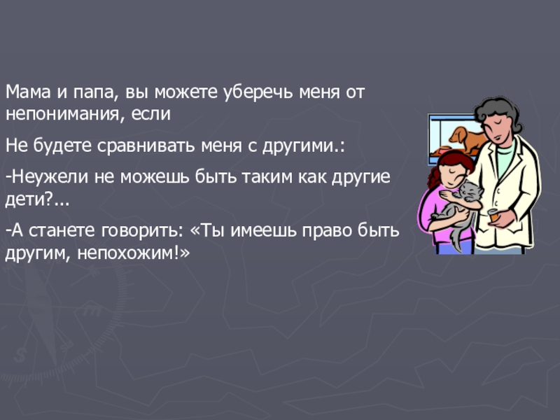Мама и папа, вы можете уберечь меня от непонимания, еслиНе будете сравнивать меня с другими.:-Неужели не можешь быть таким как другие дети?...-А станете говорить: «Ты имеешь право быть другим, непохожим!»