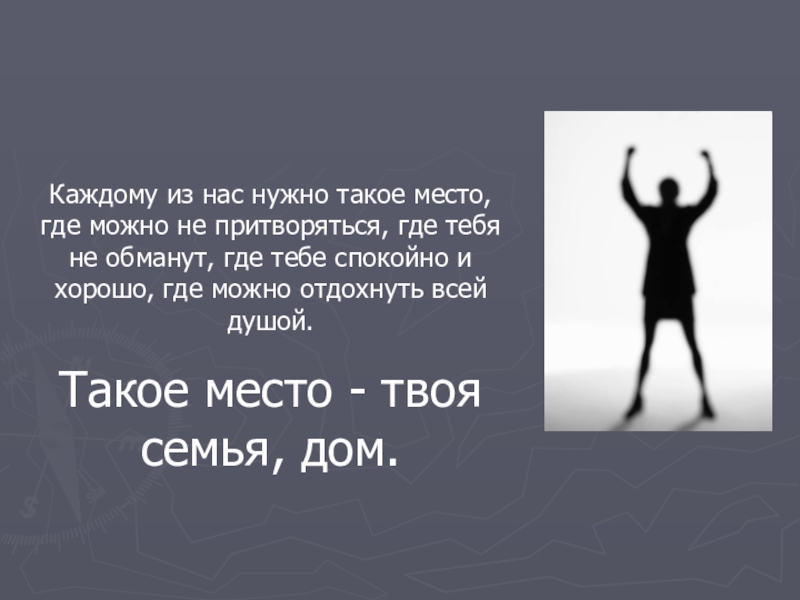 Слайд 9Каждому из нас нужно такое место, где можно не притворяться, где