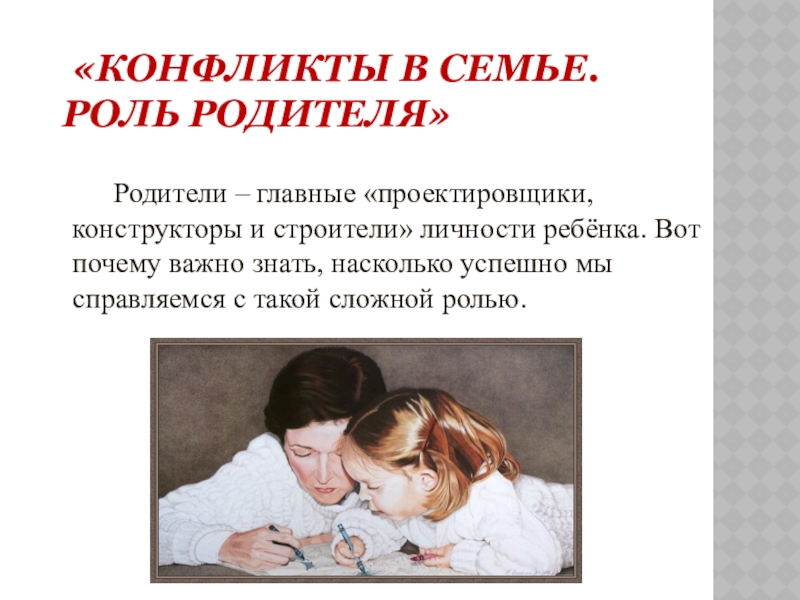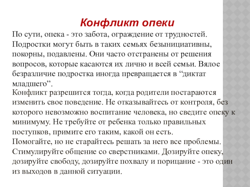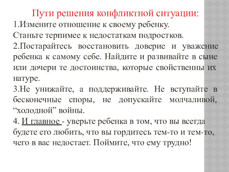 Конфликт разрешится тогда, когда родители постараются изменить свое поведение. Не отказывайтесь от контроля, без которого невозможно воспитание человека, но сведите опеку к минимуму. Не требуйте от ребенка только правильных поступков, примите его таким, какой он есть.