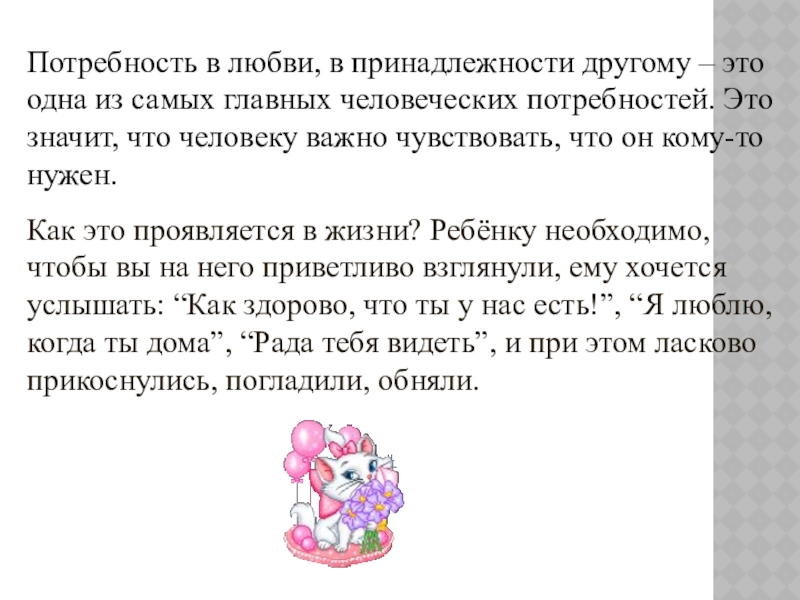 Как это проявляется в жизни? Ребёнку необходимо, чтобы вы на него приветливо взглянули, ему хочется услышать: “Как здорово, что ты у нас есть!”, “Я люблю, когда ты дома”, “Рада тебя видеть”, и при этом ласково прикоснулись, погладили, обняли.