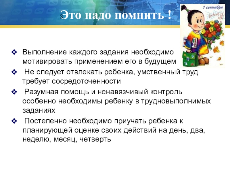 Настройте ребенка на выполнение заданий тех уроков, которые были сегодня, а задания на следующий день надо только повторить
