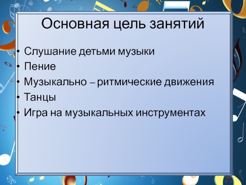 Основная цель занятийСлушание детьми музыкиПениеМузыкально – ритмические движенияТанцыИгра на музыкальных инструментах