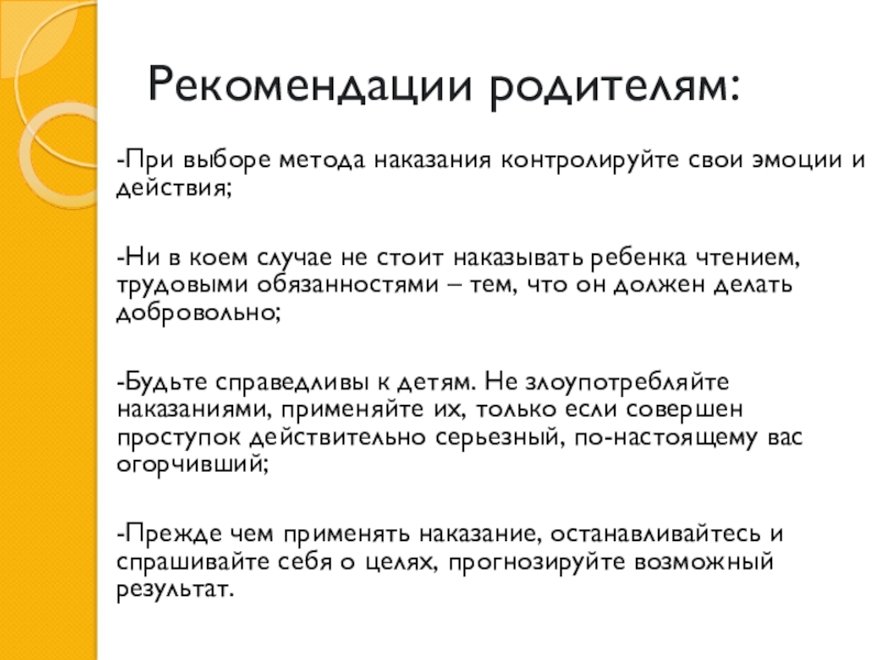 Рекомендации родителям:-При выборе метода наказания контролируйте свои эмоции и действия;-Ни в коем случае не стоит наказывать ребенка