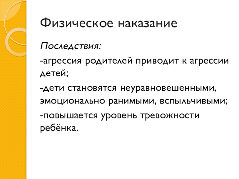 Физическое наказаниеПоследствия:-агрессия родителей приводит к агрессии детей;-дети становятся неуравновешенными, эмоционально ранимыми, вспыльчивыми;-повышается уровень тревожности ребёнка.