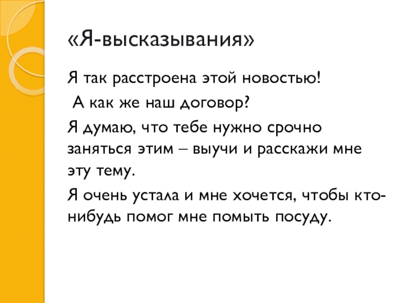 «Я-высказывания» Я так расстроена этой новостью! А как же наш договор? Я думаю, что тебе нужно срочно