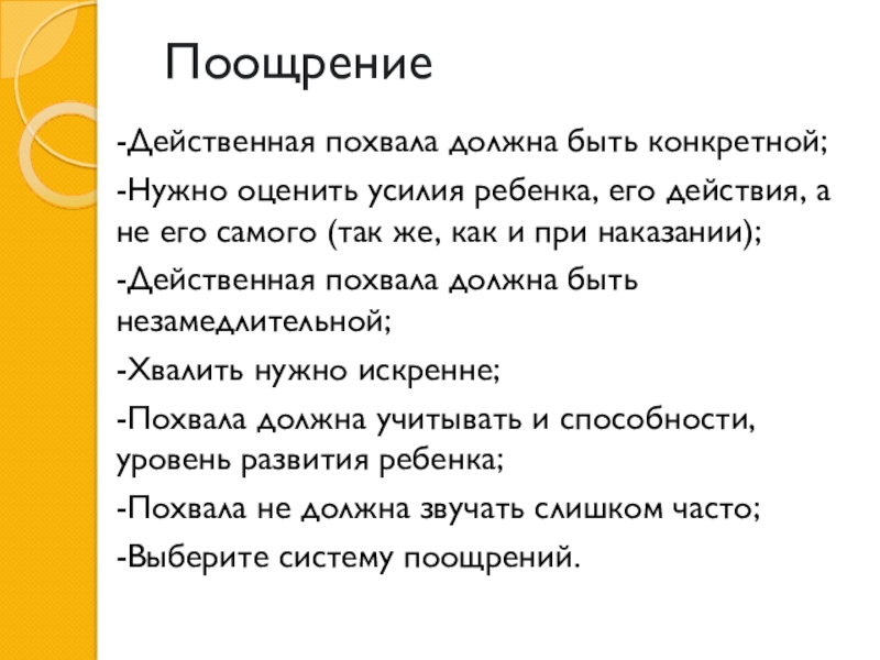 Поощрение-Действенная похвала должна быть конкретной;-Нужно оценить усилия ребенка, его действия, а не его самого (так же, как