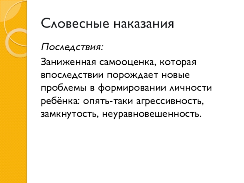 Словесные наказанияПоследствия: Заниженная самооценка, которая впоследствии порождает новые проблемы в формировании личности ребёнка: опять-таки агрессивность, замкнутость, неуравновешенность.