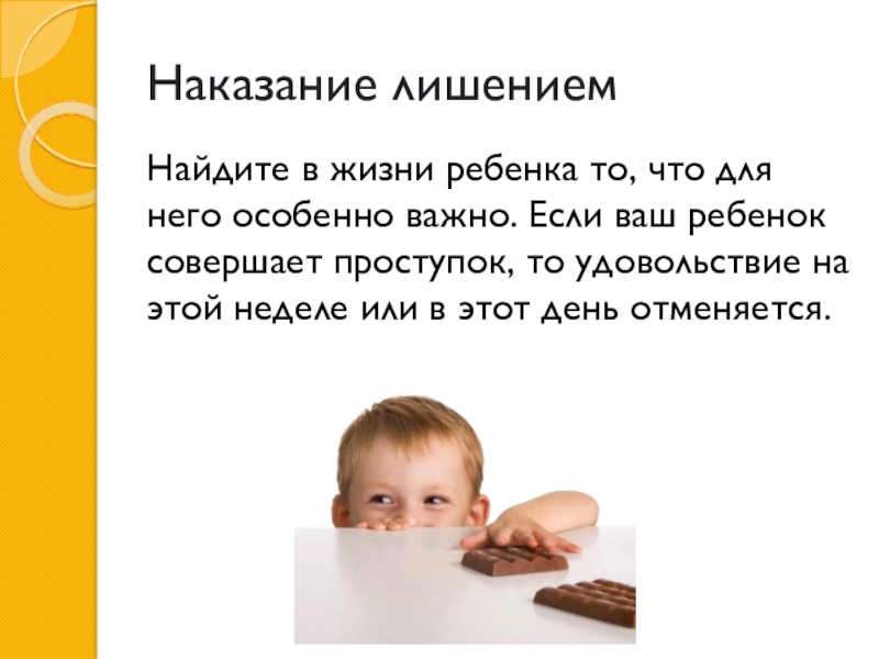 Наказание лишениемНайдите в жизни ребенка то, что для него особенно важно. Если ваш ребенок совершает проступок, то