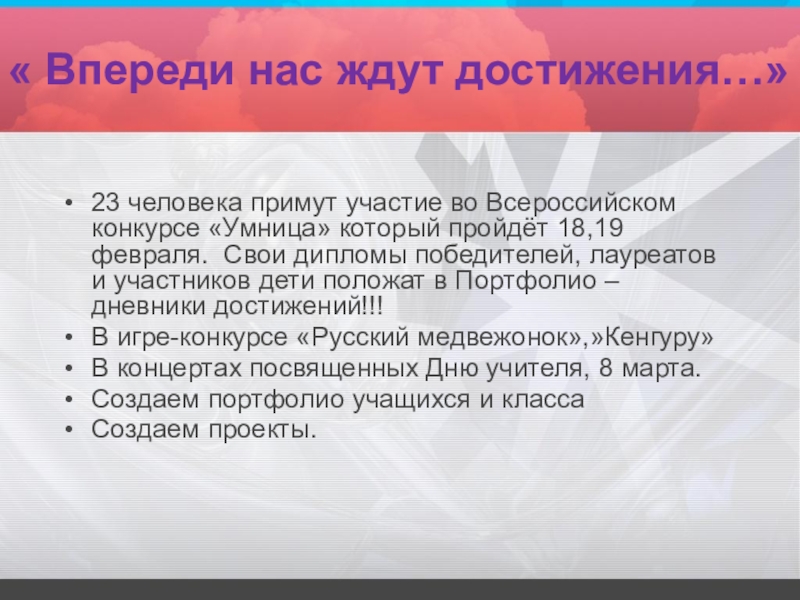 «Умница» который пройдёт 18,19 февраля. Свои дипломы победителей, лауреатов и участников дети положат в Портфолио – дневники достижений!!!