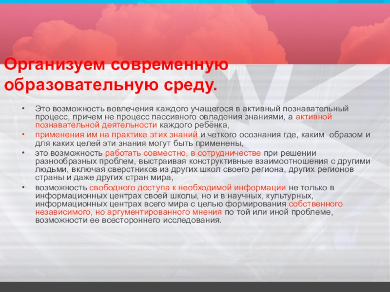 возможность свободного доступа к необходимой информации не только в информационных центрах своей школы, но и в научных, культурных, информационных центрах всего мира с целью формирования собственного независимого, но аргументированного мнения по той или иной проблеме, возможности ее всестороннего исследования.