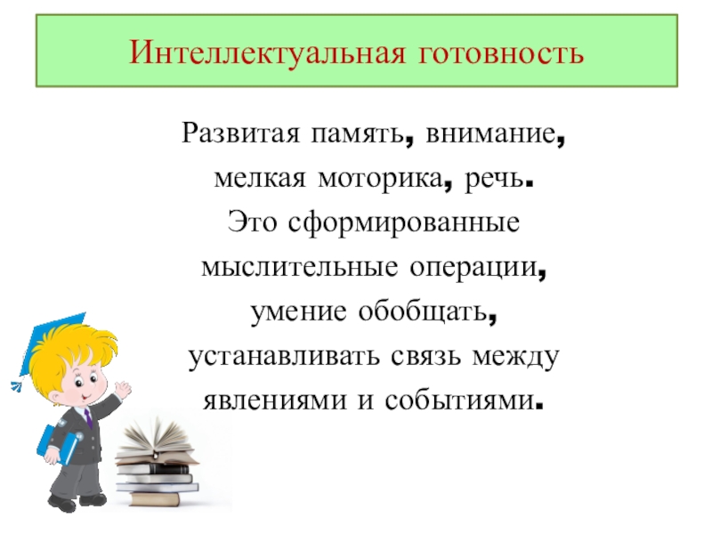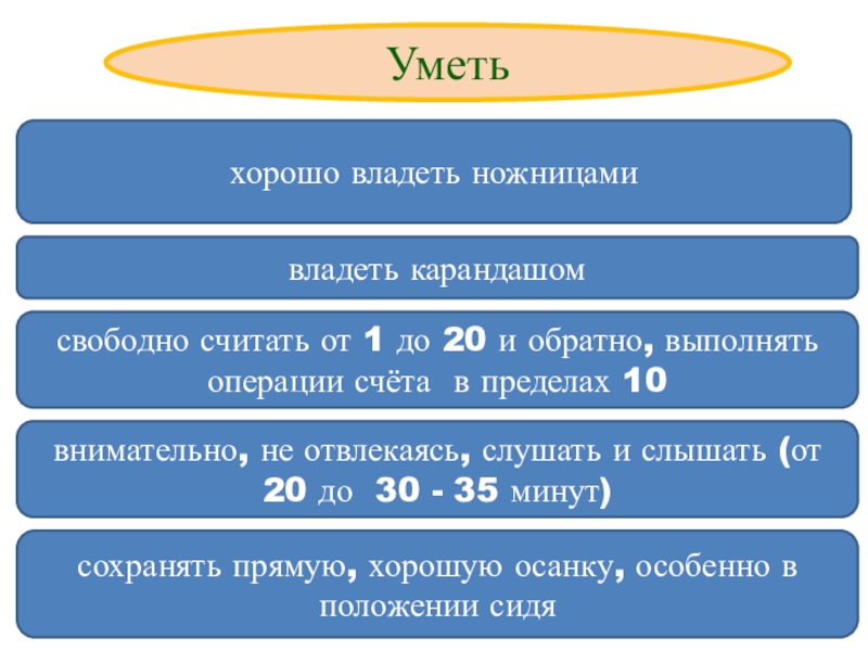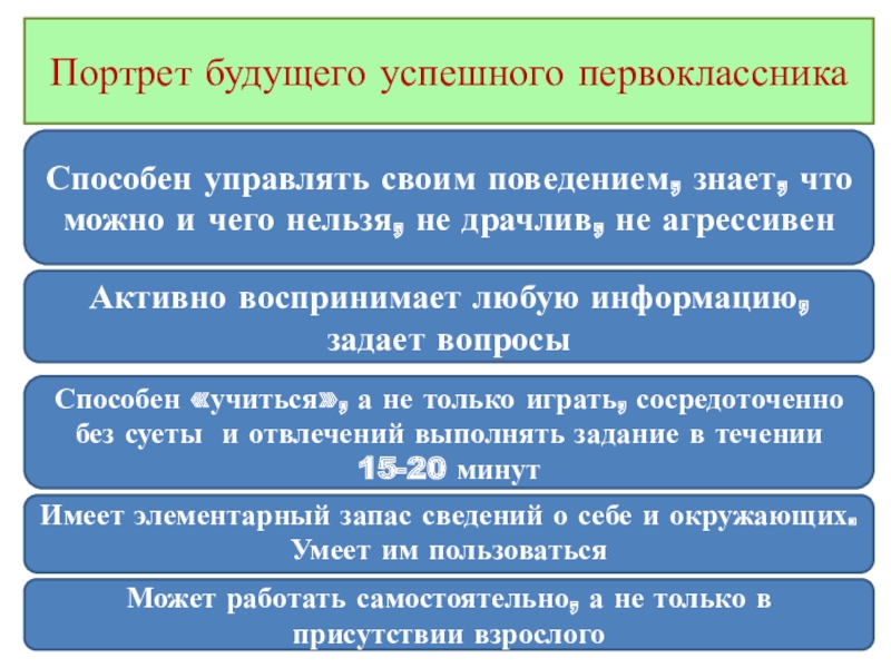 Способен «учиться», а не только играть, сосредоточенно без суеты и отвлечений выполнять задание в течении 15-20 минут