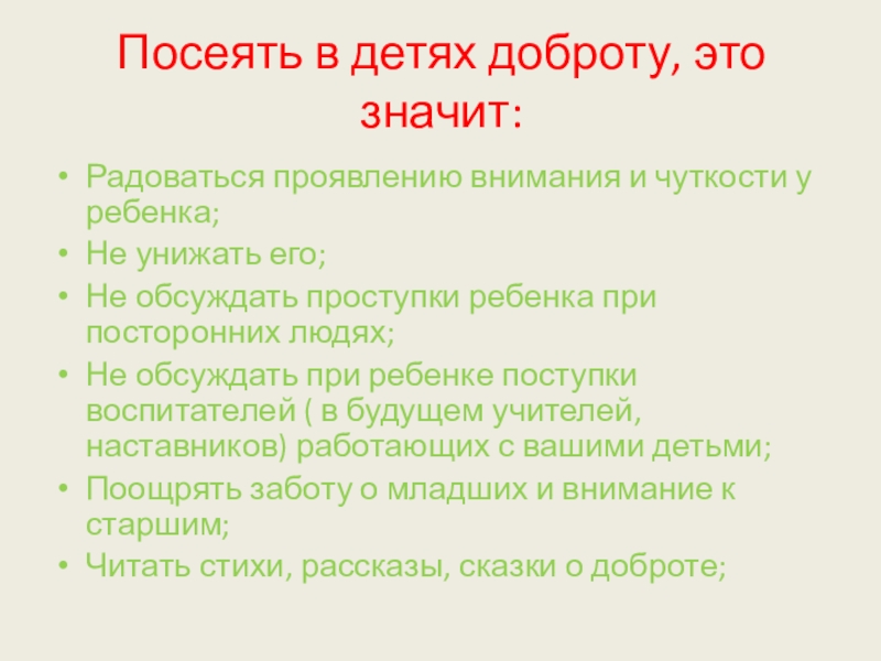 Посеять в детях доброту, это значит:Радоваться проявлению внимания и чуткости у ребенка;Не унижать его;Не обсуждать проступки ребенка