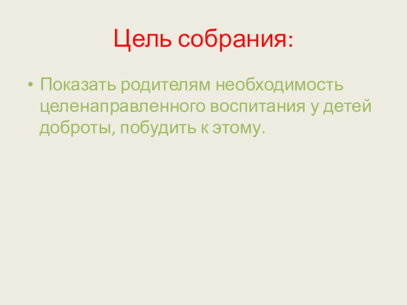 Цель собрания:Показать родителям необходимость целенаправленного воспитания у детей доброты, побудить к этому.