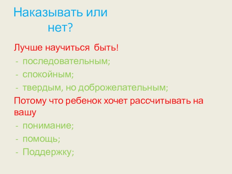 Наказывать или   нет?Лучше научиться быть!последовательным;спокойным;твердым, но доброжелательным;Потому что ребенок хочет рассчитывать на вашупонимание;помощь;Поддержку;