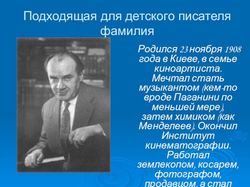 в Киеве, в семье киноартиста. Мечтал стать музыкантом (кем-то вроде Паганини по меньшей мере), затем химиком (как Менделеев). Окончил Институт кинематографии. Работал землекопом, косарем, фотографом, продавцом, а стал детским писателем.