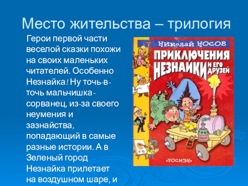 похожи на своих маленьких читателей. Особенно Незнайка! Ну точь-в-точь мальчишка-сорванец, из-за своего неумения и зазнайства, попадающий в самые разные истории. А в Зеленый город Незнайка прилетает на воздушном шаре, и находит много друзей.