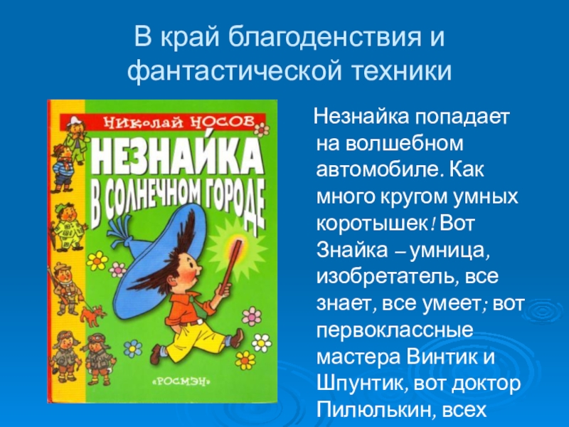 автомобиле. Как много кругом умных коротышек! Вот Знайка – умница, изобретатель, все знает, все умеет; вот первоклассные мастера Винтик и Шпунтик, вот доктор Пилюлькин, всех вылечит, обо всем знает.