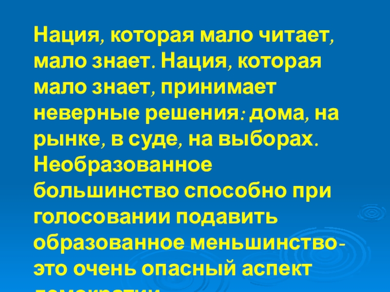 принимает неверные решения: дома, на рынке, в суде, на выборах. Необразованное большинство способно при голосовании подавить образованное меньшинство- это очень опасный аспект демократии.