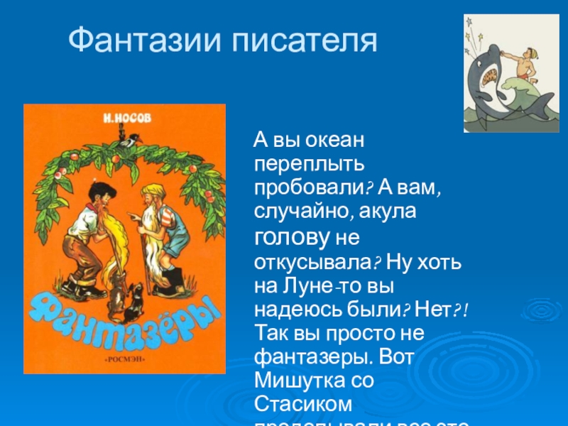 А вам, случайно, акула голову не откусывала? Ну хоть на Луне-то вы надеюсь были? Нет?! Так вы просто не фантазеры. Вот Мишутка со Стасиком проделывали все это сотни раз!!!!