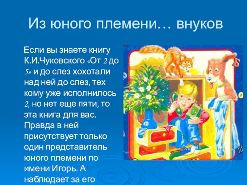 «От 2 до 5» и до слез хохотали над ней до слез, тех кому уже исполнилось 2, но нет еще пяти, то эта книга для вас. Правда в ней присутствует только один представитель юного племени по имени Игорь. А наблюдает за его проделками дед – Николай Носов.